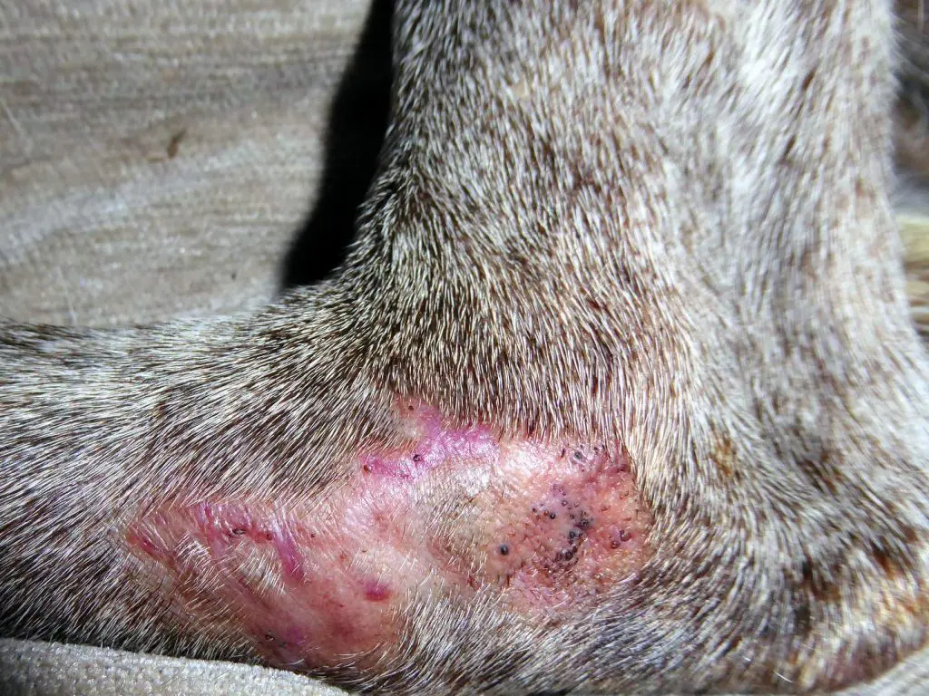 Diese bestätigt nochmals die Diagnose Leishmaniose, erkennt Symptome wie Verkrustungen an den Ohren und Ränder um die Augen (die auch auf Demodexmilben hindeuten), Fellverlust an den inneren Oberschenkeln (Hosenbildung).