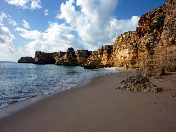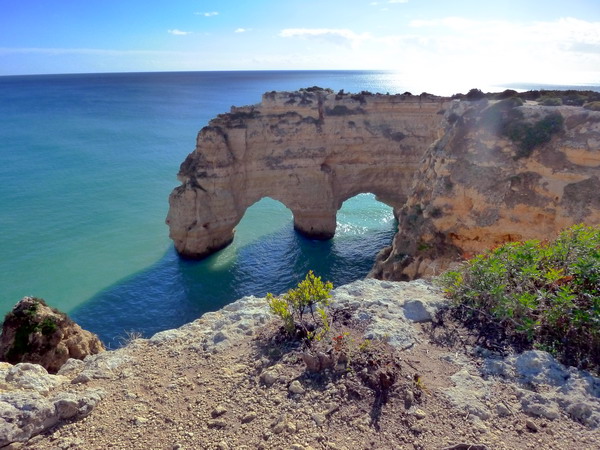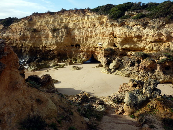 Grün war es hier. Gras, Büsche und Bäume bis hin zu großen Pinienhainen, welche die Küste bewuchsen. Zum Praia Marinha gelangten wir über einen schmalen gepflasterten Weg, der links am Ende des Parklatzes abging. Er war grün bewachsen – und es roch so gut. Ich könnte nicht sagen, was für ein Duft es war, doch es roch köstlich. Eine Steintreppe führte zum Strand hinunter, wo sich ein kleines Restaurant befand, welches geschlossen war. Vor der gelben Steilküste gab es einen schmalen Sandstreifen, der später etwas breiter wurde. Große Felsbrocken lagen im Sand und Türme aus Felsen standen im Wasser. Felsbogen und Felstunnel wurden vom Meer umspült und leuchteten in der Sonne warmgelb.