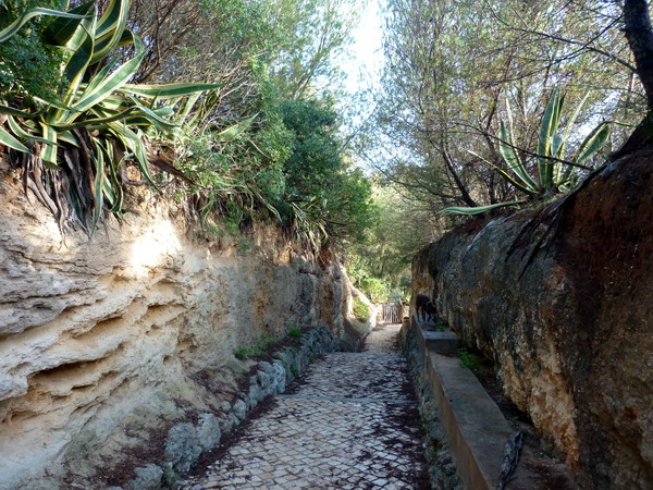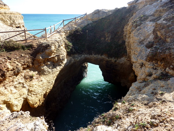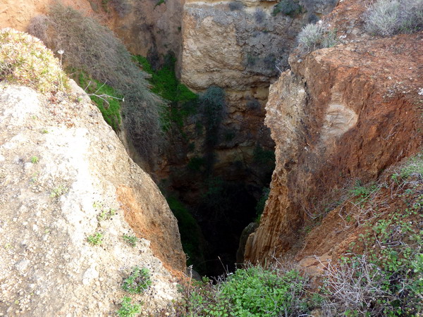 Nachdem wir den Strand besucht hatten und Lucy ein paar Bahnen geschwommen war, wollte ich dem Wanderweg vom Praia Marinha nach Benagil ein Stück folgen, der auf den Klippen entlang führte. Ich entschied mich in Richtung Westen zu gehen bis in den nächsten Ort – Benagil. An ein paar Stellen gab es Aussichtspunkte, von denen aus die Felsskulpturen im Meer besonders gut zu sehen waren. Lucy und ich kamen an riesigen und sehr tiefen Löchern vorbei (zum Glück eingezäunt), aus denen das Brausen der Wellen zu hören waren, obwohl sie ein gutes Stück vom Meer entfernt waren. Bei manchen war ganz tief unten das Wasser zu sehen und die hereinbrechenden Wellen. Unheimlich – wie löchrig und ausgehöhlt die Küste sein musste.