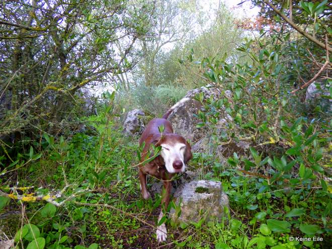 Auch Lucy ist mit Begeisterung dabei. Sie scheint zwar keine Ahnung zu haben, wonach wir eigentlich suchen, doch anscheinend findet sie es großartig endlich mal mit uns gemeinsam die Büsche abzuschnuppern.