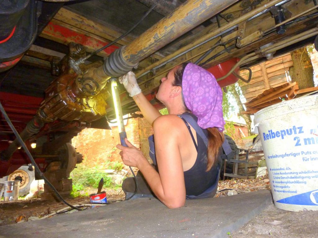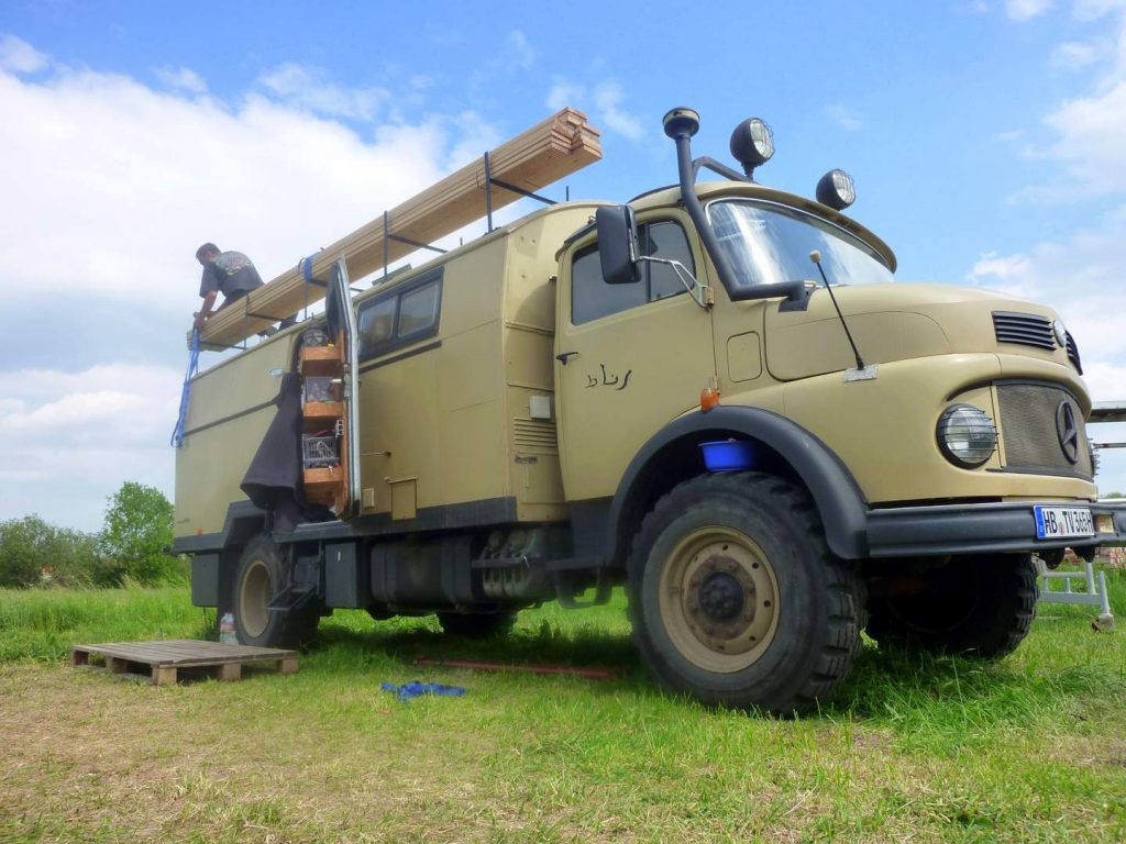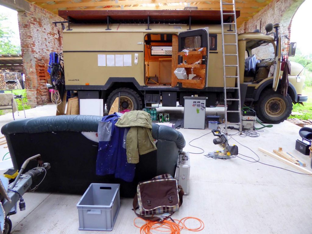 Wir haben liebe Freunde in Brandenburg kennengelernt, bei denen wir mehrere Sommer verbringen durften und dort auch den Laster in Schuss halten konnten. Wir haben die Technik aufgearbeitet, den Rost bekämpft, eine Dachterrasse gebaut, einen neuen Innenausbau umgesetzt.