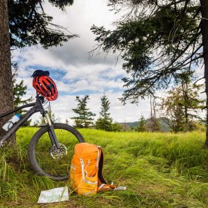 - Packtaschen mit Zelt, Isomatte und Schlafsack.