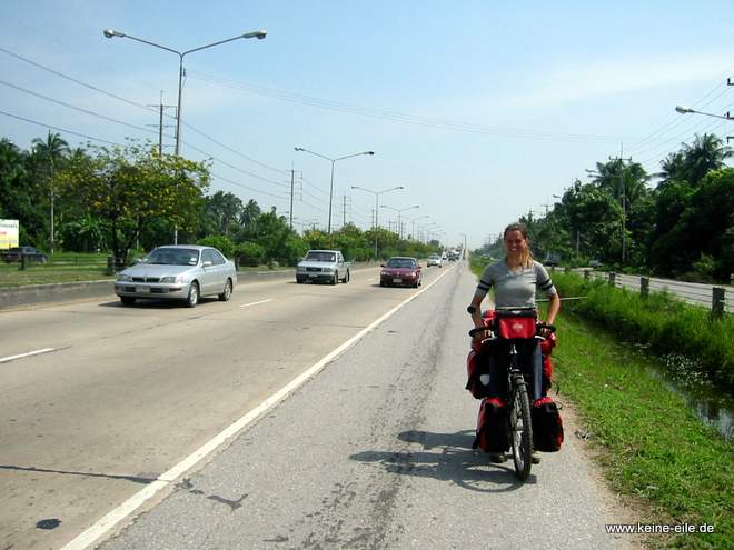 Nachdem wir Bangkok verlassen haben sind wir überrascht, denn hier sieht es ganz anders aus, als am östlichen Ende der Stadt. Nicht Bambus- und Wellblechhütten säumen die Straße, sondern schmucke Einfamilienhaussiedlungen, große Villen mit parkähnlichen Gärten und die Gegend macht einen viel gepflegteren Eindruck.