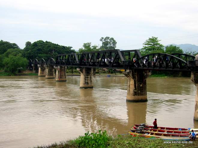 Wo wir nun schon mal hier sind, geben wir uns das volle Kulturprogramm. Und so führt uns unser erster Weg zur sagenumwobenen, legendären, geschichtsträchtigen Brücke am Kwai. Die Brücke ist nicht mehr das Original, sondern ein Nachbau. Weder sonderlich schön und auch nicht besonders spektakulär. So ist es wohl nur die Geschichte der Brücke, die die Leute anzieht. Busladungen voller Touristen werden angekarrt, knipsen sich die Finger wund, bekommen ein Restaurant zugewiesen, essen, einsteigen, Abfahrt.