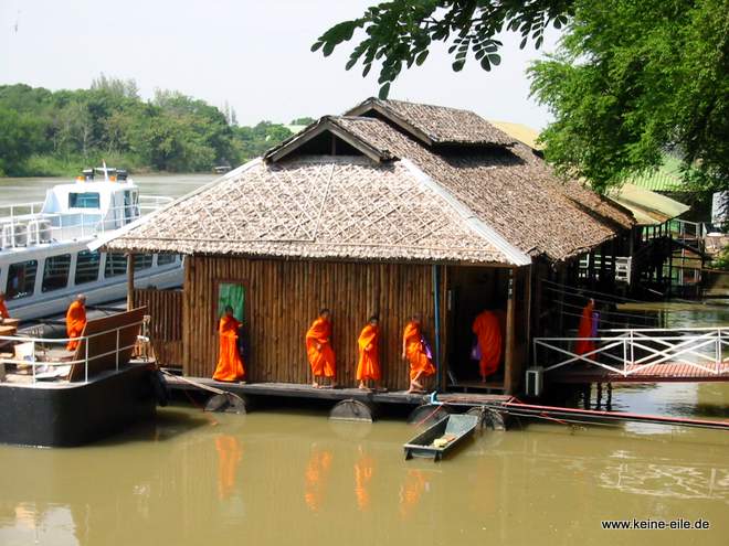 Die Stadt Kanchanaburi liegt am River Kwai und ist ein beliebtes Ausflugsziel für Thailänder. An der Uferpromenade im Stadtzentrum, reiht sich Restaurant an Diskothek und von hier starten auch die zahlreichen Disko- und Restaurantflöße mit denen man sich über den Fluss fahren lassen kann. Mit einem Speedboot kann man sich zum Fotografieren zur Brücke am Kwai fahren lassen, was auch rege in Anspruch genommen wird. Die Speedboote sind 5-8 Meter lange Holzboote, auf die man riesige LKW Motoren gebaut hat. Unglaublich schnell und höllisch laut.