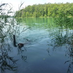 Lucy im Liepnitzsee: balancierend auf einem Baustamm wartet sie auf Unterhaltung