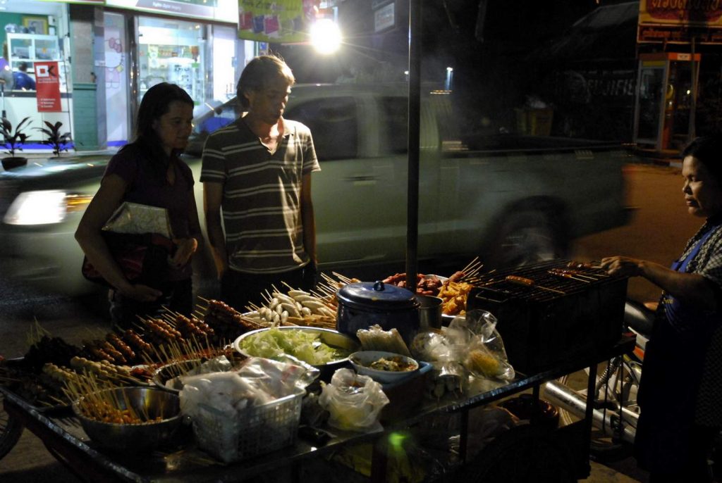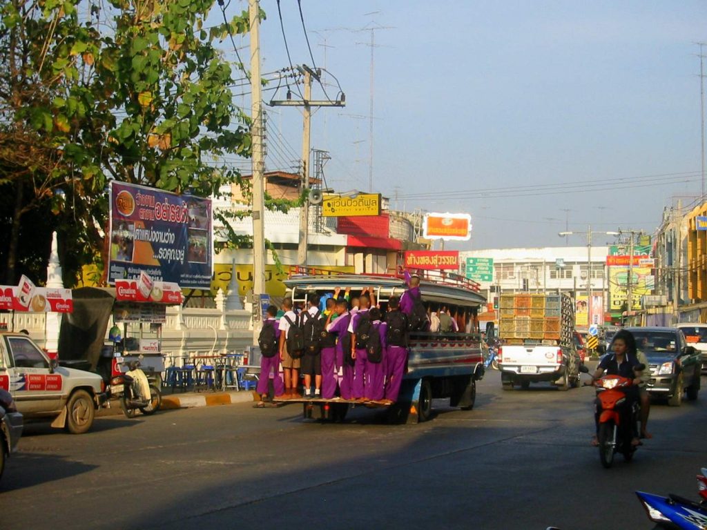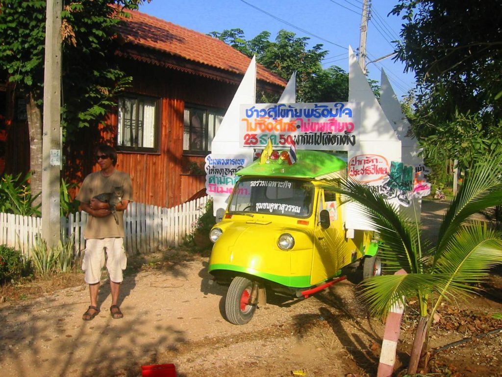 Wie Ayutthaya ist Sukhothai für die meisten Touristen nur eine Durchgangsstation fuer 1-2 Nächte. Wer als Tourist ein paar Tage länger hier ist, fällt auf. Der Mann aus dem Kiosk an der Ecke grüßt freundlich, wenn wir vorbeifahren, die Mädels im Restaurant wissen nach dem 3. Besuch, dass Steffi kein Eis zu ihrer Sprite möchte und Olaf lieber Cola trinkt. Die Obstfrau auf dem Markt sucht uns das größte Paket geschälte Pomelo heraus und der Zeitungsverkäufer hält seine letzte Ausgabe der “The Nation” für uns zurück.