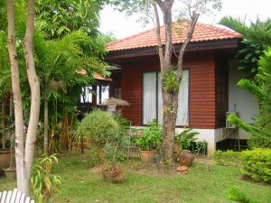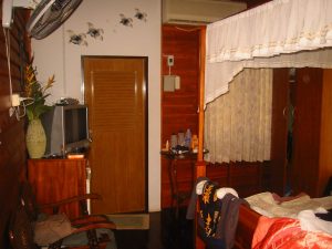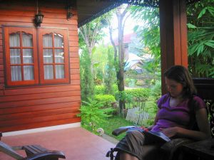 In Svens Gästehaus Lotus Place gibt es für uns kein bezahlbares Zimmer mehr. Und so machen wir uns nach einem gemeinsamen kühlen Bier auf die Suche nach einer Unterkunft. Etwas abseits auf der anderen Flussseite werden wir fündig und beziehen im KTT Resort einen kleinen gemütlichen Bungalow mit eigenem Bad (warmes Wasser!), Klimaanlage, TV (leider nur Thai), kleiner Kühlschrank, Terasse, Himmelbett (ohne Himmel) und “free coffee” an der Rezeption.