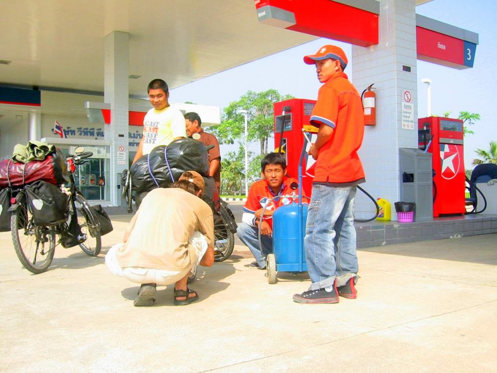 Große Tankstellen scheinen uns oft personell überbesetzt zu sein, denn innerhalb kürzester Zeit haben wir Hilfe von bis zu 16 helfenden Händen, die Ventildeckel abschrauben und uns freudig die Arbeit aus den Händen nehmen.