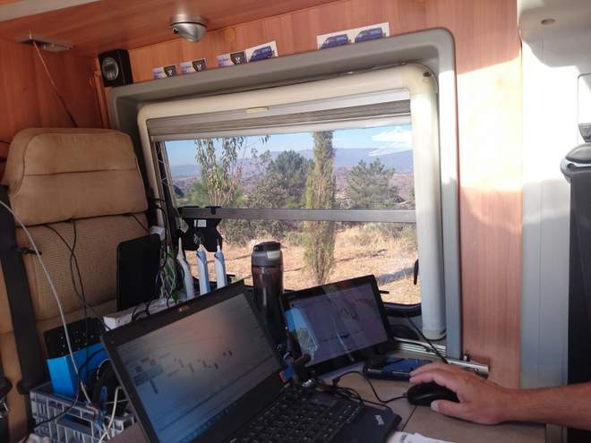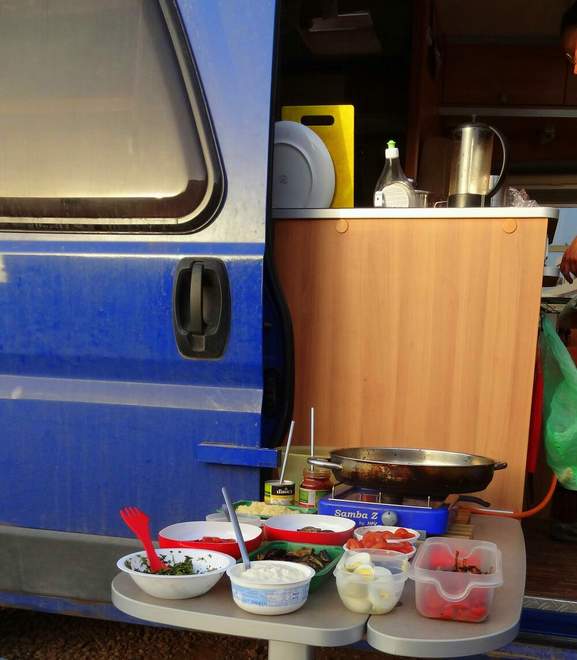 Wir haben im Auto alles, was wir zum Leben benötigen: Büro, Esszimmer, Wohnzimmer in einem, gleich neben Küche, Bad und Schlafzimmer. Nur zum Vorratskeller und Stauraum für meine Kochbücher müssen wir einmal ums Auto zur Hecktür ;) .