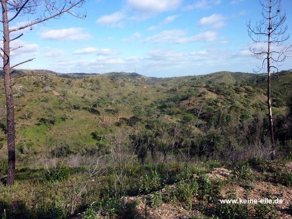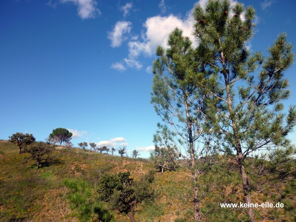 Auf dem Weg nach „São Bras de Alportel“ schlängelten wir uns durch eine grüne Hügellandschaft. Die Hänge waren mit einem lichten Laubwald bewachsen. Viele der Hügel waren allerdings recht kahl. Auf manchen standen nur vereinzelt ein paar Kork- oder Steineichen. Der Rest bestand aus Gebüsch, oder einfach nur aus Kies mit grünen Flecken.