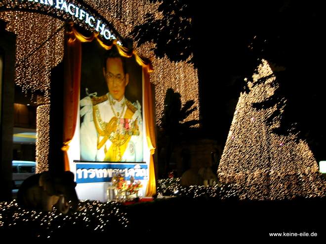 Als wir auf dem Weg in unser Hotel den Radjadamneon Klang überqueren, lassen die vielen, mit Lichterketten geschmückten Bäume das nächste bevorstehende Großereignis in der Stadt erkennen. Am 5. Dezember wird seine Majestät König Bhumipol Adulyadey, Rama IX 75 Jahre alt. Wir machen uns Gedanken, ob wir vielleicht noch so lange in Bangkok bleiben, um uns unauffällig unter die Partygäste zu mischen.