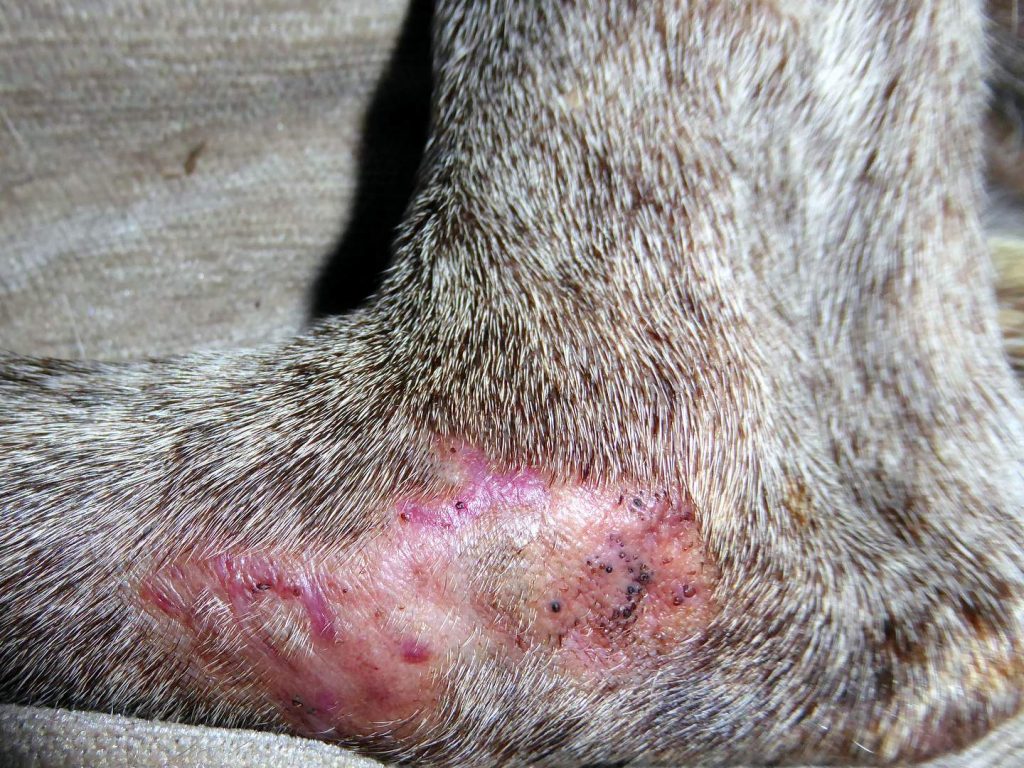 Diese bestätigt nochmals die Diagnose Leishmaniose, erkennt Symptome wie Verkrustungen an den Ohren und Ränder um die Augen (die auch auf Demodexmilben hindeuten), Fellverlust an den inneren Oberschenkeln (Hosenbildung).