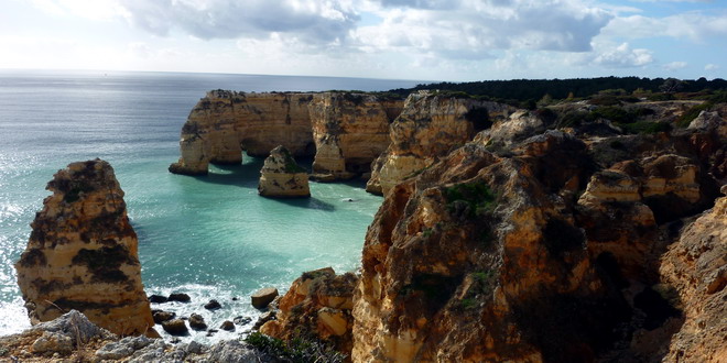 Grün war es hier. Gras, Büsche und Bäume bis hin zu großen Pinienhainen, welche die Küste bewuchsen. Zum Praia Marinha gelangten wir über einen schmalen gepflasterten Weg, der links am Ende des Parklatzes abging. Er war grün bewachsen – und es roch so gut. Ich könnte nicht sagen, was für ein Duft es war, doch es roch köstlich. Eine Steintreppe führte zum Strand hinunter, wo sich ein kleines Restaurant befand, welches geschlossen war. Vor der gelben Steilküste gab es einen schmalen Sandstreifen, der später etwas breiter wurde. Große Felsbrocken lagen im Sand und Türme aus Felsen standen im Wasser. Felsbogen und Felstunnel wurden vom Meer umspült und leuchteten in der Sonne warmgelb.