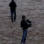 Es ist viel los am Strand: Leute reiten auf Pferden über den Sand und werden dabei gefilmt.
