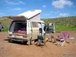 Von der Hauptstrasse zweigt eine ziemlich holprige Piste ab. Nach 2 km erreicht man am Ende ein Plateau etwas oberhalb einer Bucht mit ungefähr 200 Metern Sandstrand.