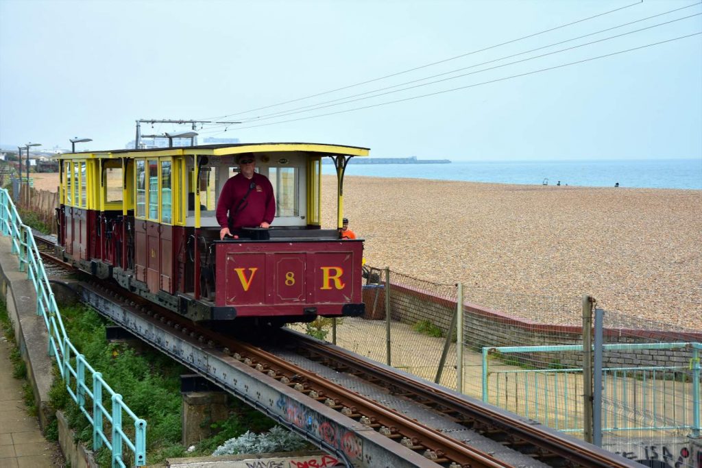 Alternativ können wir auf unsere Klappräder zurückgreifen, grundsätzlich praktisch, angesichts der Serpentinenstraße an der Kalksteinküste dann wieder doch nicht. Aber wir wählen eine originelle Möglichkeit: die Fahrt mit einer elektrischen Bahn aus viktorianischen Zeiten. Die Gleise führen von der Marina bis zum Brighton Pier, dem 100 Jahre alten Vergnügungspark, den jeder Brighton-Tourist gesehen haben muss.