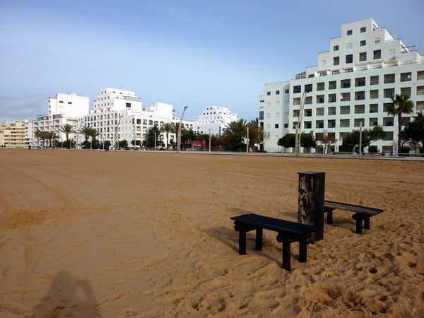 Zu Fuß konnten wir am Strand entlang nach Quarteira laufen. An einer langen Promenade standen Appartementhäuser, vielleicht fünf bis zehn Etagen hoch. Eine Wohnung in erster Reihe ist sicher super. Den ganzen Tag Sonne und Blick aufs Meer und den Strand vom Balkon aus. Hätte man allerdings ein Zimmer in zweiter Reihe, oder nach hinten raus, sähe man kaum die Sonne und schon gar nicht das Meer (also immer genau den Reisekatalog durchlesen!).