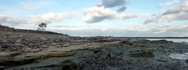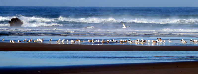 Vom Strand ist bei Flut nicht viel zu sehen. Er zieht sich am Fuße der Klippen entlang, gegen die jetzt die Wellen schlagen.
