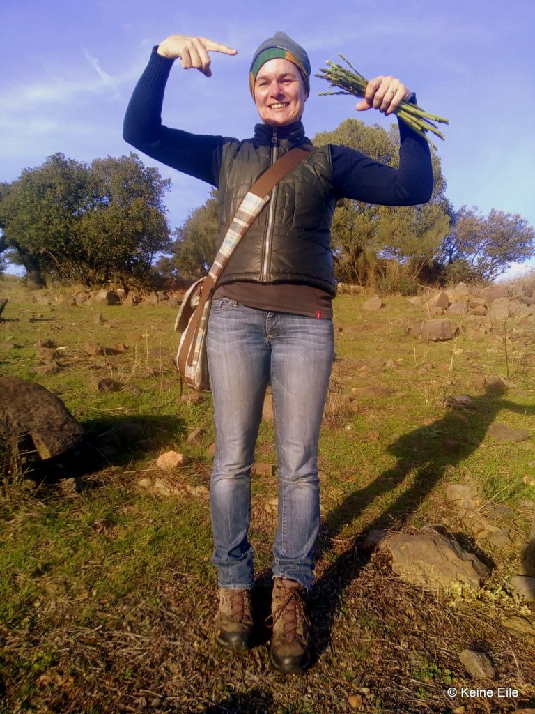 Das Wetter spielt mit und wir durchstreifen die Gegend. Wilder Spargel wächst in den Büschen und uns packt das Jagdfieber. 3 Mal in den 10 Tagen gönnen wir uns den Luxus und sammeln jeweils mehr als ein Pfund Spargel. Wie cool, seine Nahrung in der Natur pflücken zu können. Und dann auch noch eine solche Delikatesse. Es ist sehr zeitaufwendig, man verkratzt sich Arme und Hände, weil die Spargelbüsche krass stachelig sind, wir aber zu faul uns Handschuhe anzuziehen.