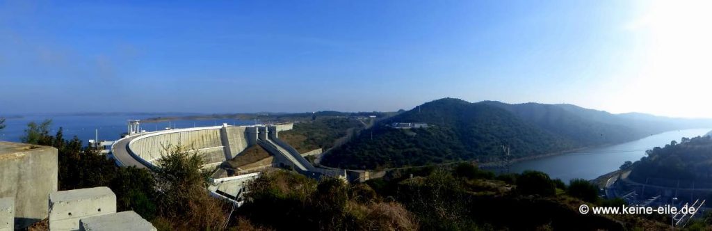 Nach einigen Kilometern erreichen wir die Staumauer. Schon fast wehmütig – weil der Alqueva Stausee, an dem es uns so gut gefallen hat – nun endet und der Rio Guadiana im weiteren Verlauf sein Gesicht total ändert und wieder zu einem fast stinknormalen Fluss wird, der durch sein angestammtes Bett fließt.