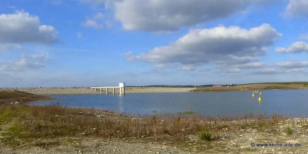 Trotzdem wir recht spät am Tag losfahren, begleitet uns der dichte Nebel – wie gewohnt – den ganzen Vormittag. Was sehr schade ist. Da wir noch ein ganzes Stück durch ein nahezu unbesiedeltes Gebiet fahren. Gelegentlich stehen ein paar Kühe am Wegesrand und immer wieder gibt es herrliche Ausblicke auf den Stausee Alqueva. Die Gegend bietet noch viele weitere Plätze, die zum Verweilen einladen.