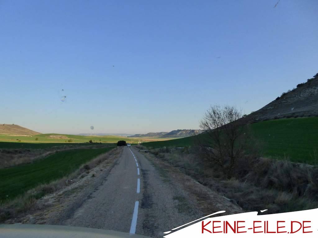 Da parallel zur Autobahn eine Nationalstraße verläuft, auf der überhaupt kein Verkehr ist, fahren wir auf dieser. Angenehmes Reisen bei entspannten 60 km/h. Bis wir ein gutes Stück vor Burgos der Meinung sind, dass wir für den ersten Tag schon genug erlebt haben.