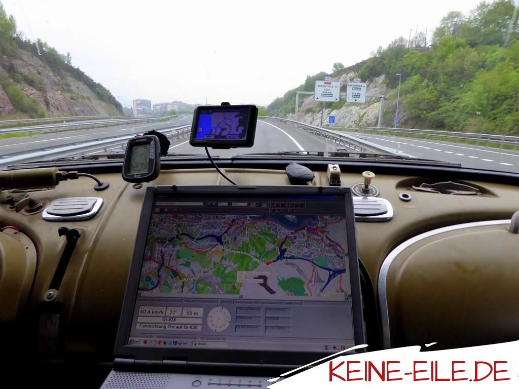So geht´s nach 10 Minuten Zwangsstopp weiter. Nervös waren wir eigentlich nicht. Höchstens ein wenig aufgeregt, weil es für uns eine Premiere war. In all der Zeit in der wir mit diesem Fahrzeug unterwegs sind, hatten wir noch nie Kontakt mit den Behörden. Weder im Rahmen einer normalen Polizeikontrolle, noch bei Grenzüberfahrten. Was uns selbst wundert. Als das Auto für uns neu war, haben wir eigentlich immer gedacht, dass so ein Haufen Altmetall auf Rädern die Neugier der Staatsmacht auf sich zieht. Aber 8 Jahre lang und fast 50.000 km auf den Straßen Europas hat sich nie jemand für uns interessiert.