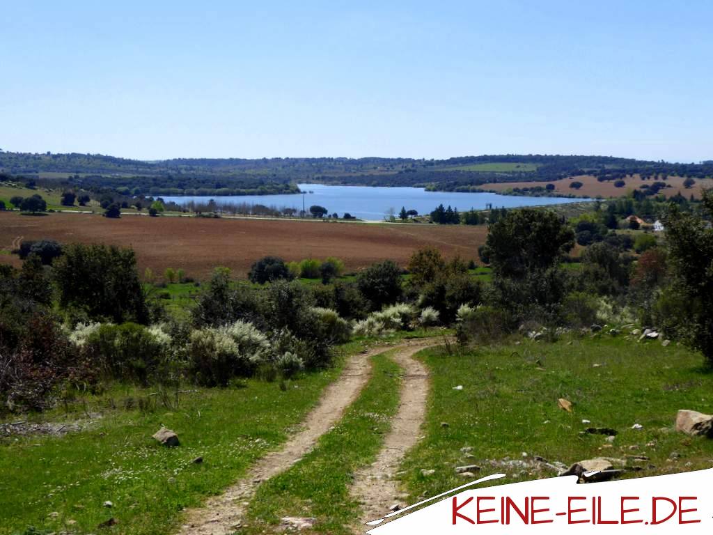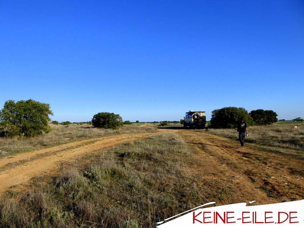 Unterschied zu dem Hügel, von dem wir kommen ist, dass es hier überwiegend große landwirtschaftlich genutzte Fläche gibt. Die Äcker sind überall. Das war in Portugal eher nicht so. Dort gab es mal 1, 2 Hektar Wein, daneben 1, 2 Hektar Oliven oder 1, 2 Hektar gepflügten Acker und dazwischen mal eine Wiese mit Steineichen.