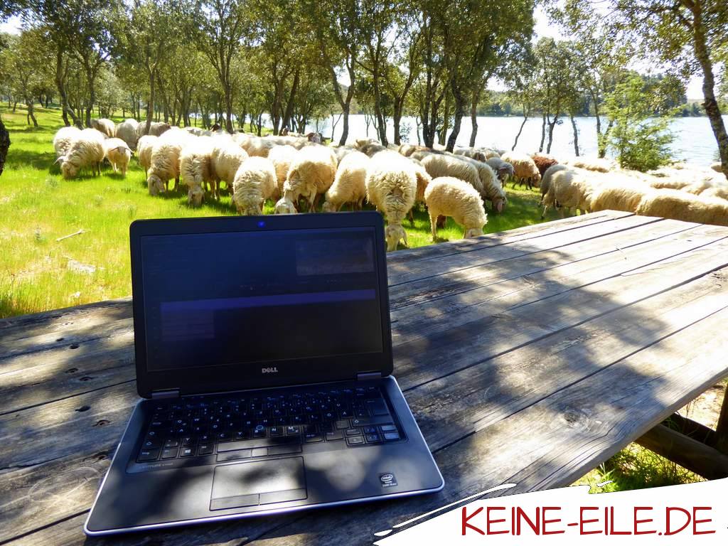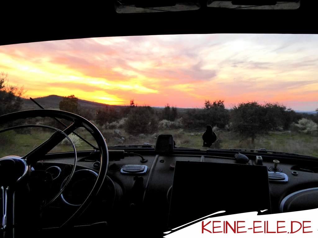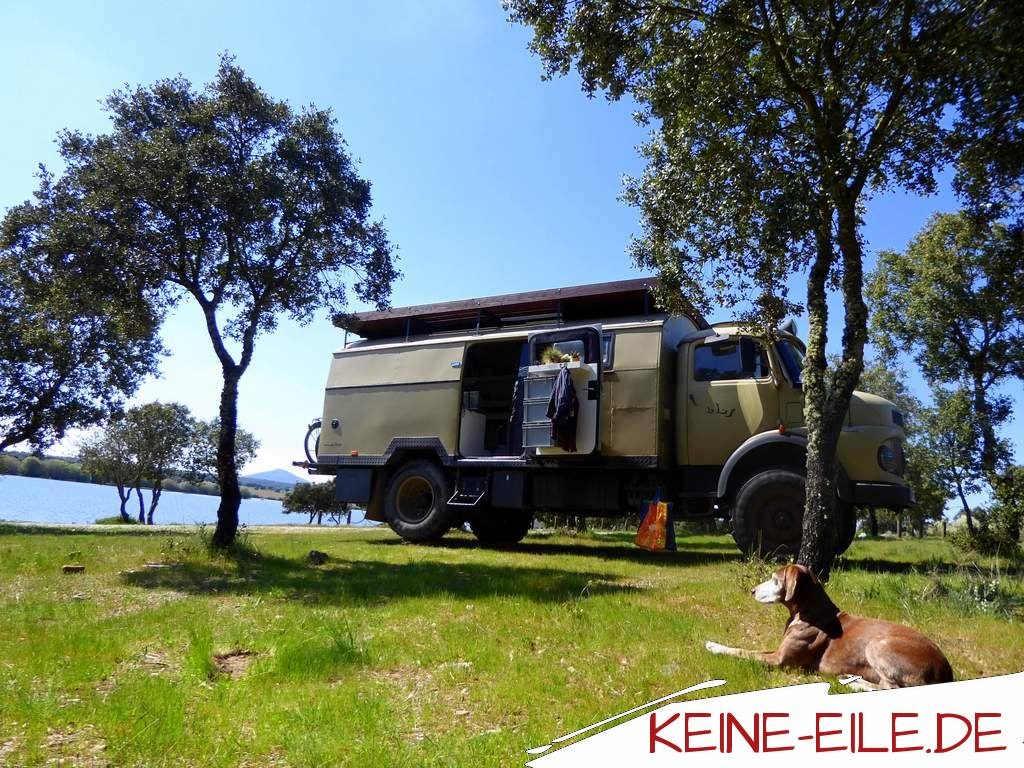 Während unten am See doch hin und wieder vor allem portugiesische Tagesausflügler vorbeikamen, stehen wir hier oben angenehm abseits vom eigentlich nur spärlich vorhandenen Trubel unten im Tal. Es ist windstill und knalleheiß. Sonst haben wir meistens mit der Tür zur Sonne geparkt. Doch seit einiger Zeit hat sich unser Parkverhalten verändert. Wir versuchen nun die Tür auf der Schattenseite zu haben, weil es sonst spätestens zum Mittag im Auto zu warm wird.