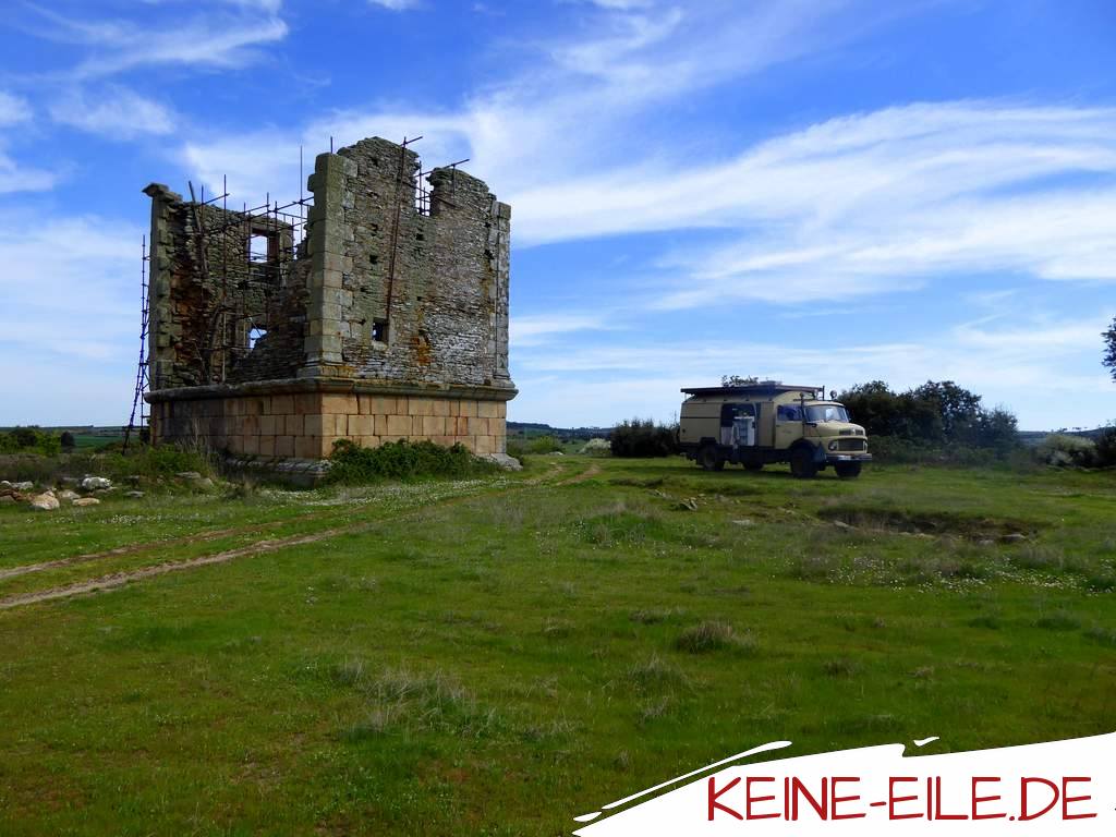 Bis dahin haben wir noch ein paar Tage Zeit. Wir schauen uns noch einen letzten Stausee in Portugal an. Den Barragem de Almeida. Ein paar entspannte Tage bei bestem Wetter werden uns gegönnt. Zuerst parken wir an einem Picknickplatz direkt am See. Wo wir die Gelegenheit haben unsere letzten Doradenbestände zu grillieren. Bis wir bei einem unserer ausgedehnten Spaziergänge (wann hört eigentlich Spazieren gehen auf und wandern fängt an?) die Ruinen eines ehemaligen Wehrturmes stoßen. Mit super Aussicht über die Landschaft. Am darauffolgenden Tag parken wir um.