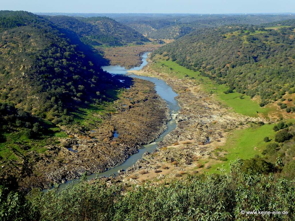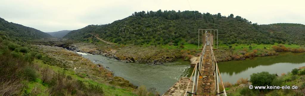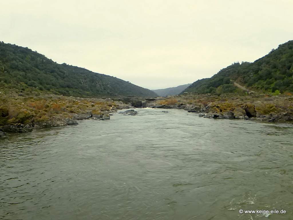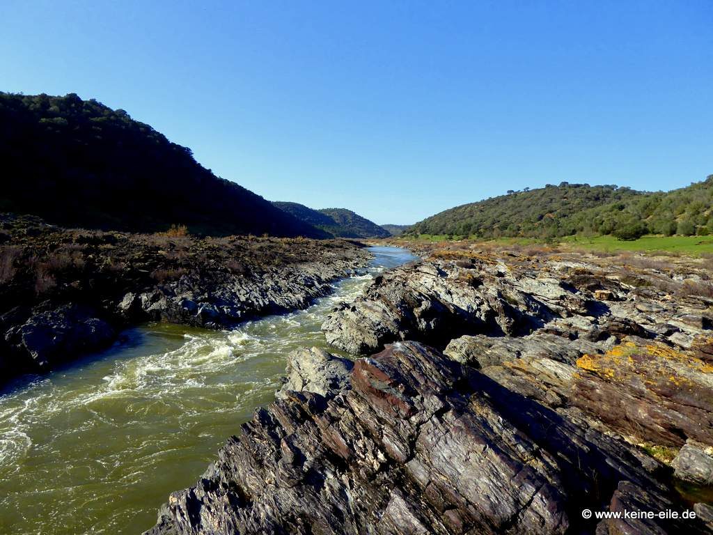 Der eben noch so breite und ruhige Rio Guadiana fließt nun durch ein eigentlich breites Tal. Doch er zwängt sich in reißender Geschwindigkeit durch eine schmale Rinne im Fels.