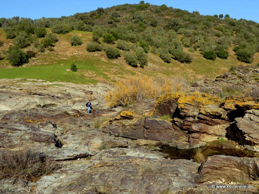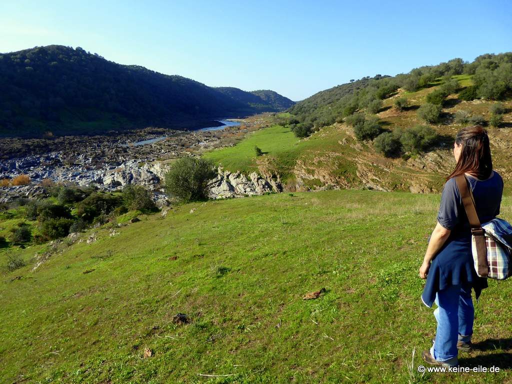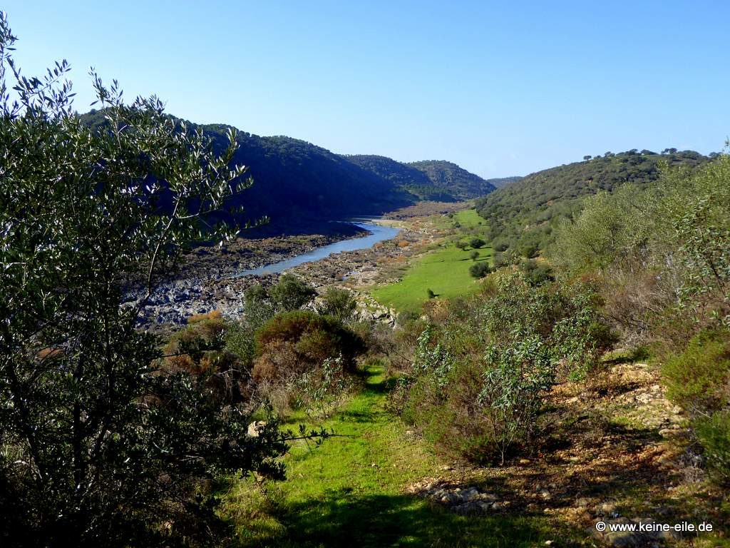 Jetzt sehen wir auch „unser“ Tal wieder, durch das wir uns noch eben vorgekämpft haben. Aus ihm kommt ein kleiner Fluss gesprudelt, der in den Guadiana mündet.