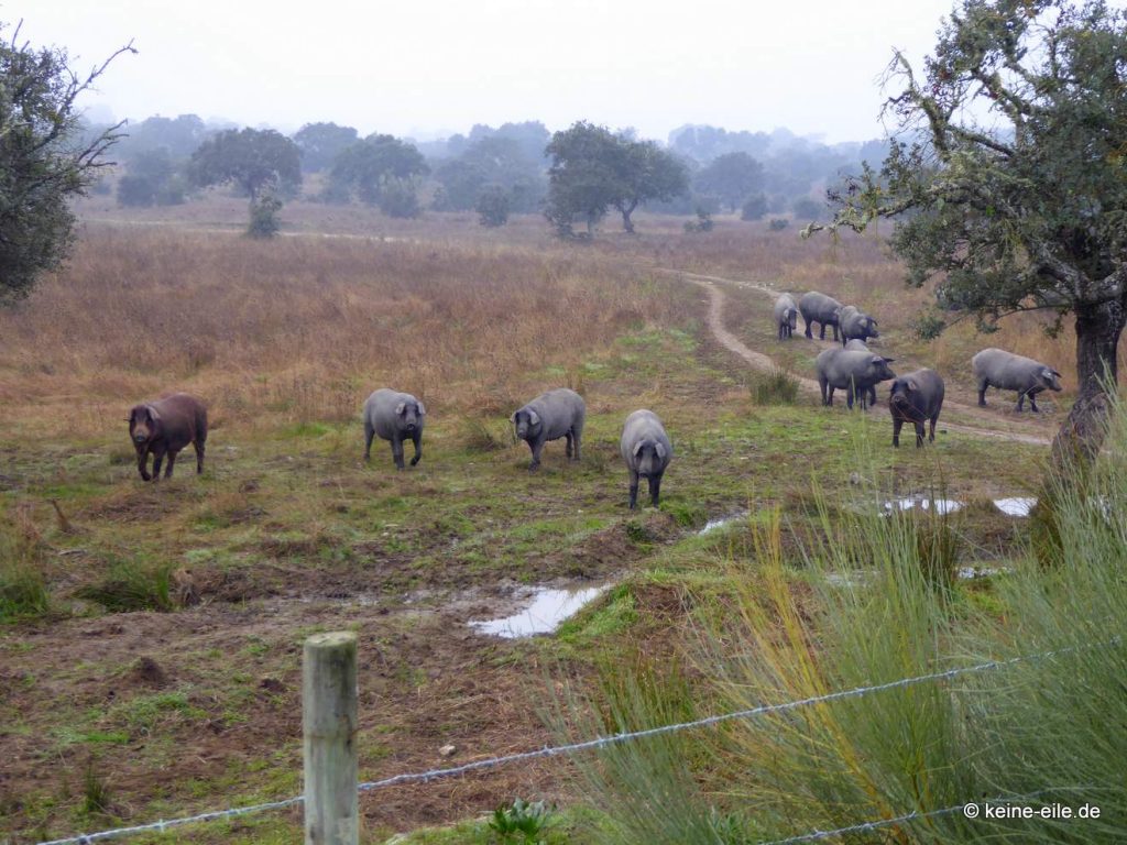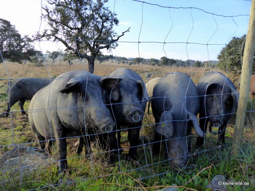 Hinterm Zaun tauchen schwarze Schweine auf. Die habe ich doch gestern noch in dem Film übers Alentejo gesehen. Die Leben unter den Steineichen, fressen Moos und Gras und Eicheln und wenn sie so richtig dick und rund sind kommen sie in den Schinken. Tja. Aber wohl immer noch besser als das ganze kurze Leben im Stall zu verbringen und die Sonne nie zu sehen.